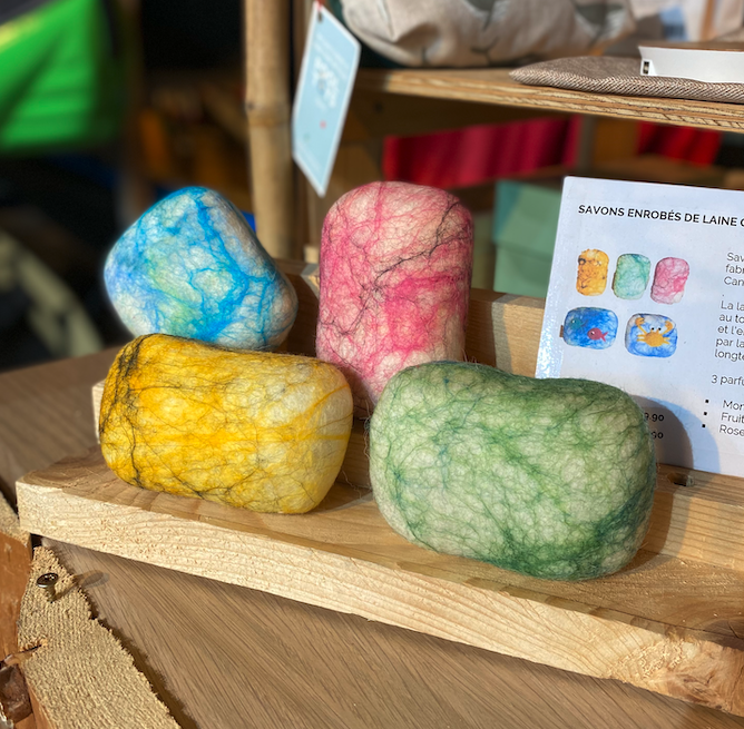 Savons artisanaux enrobés de laine Bio fabriqués à Fuerteventura dans les Iles Canaries.